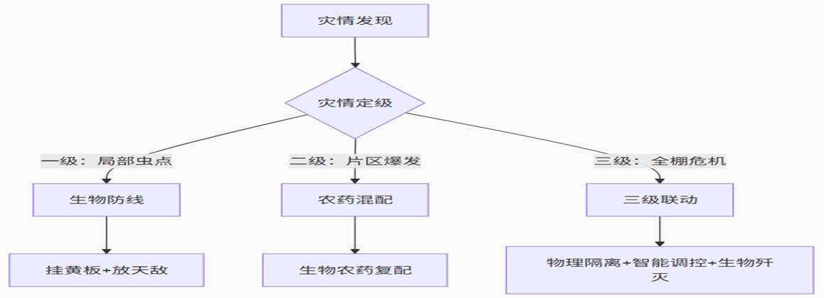 一级(轻度——局部虫点):修复防虫网+光色诱杀+设施环控调节+增加天敌释放量20%。